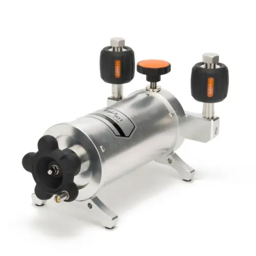 The 901B Low Pressure Test Pump is a hand operated pressure pump designed to generate pressures from -6 psi (-0.4 bar) to 6 psi (0.4 bar). A high-quality screw press is designed for fine pressure adjustment, with an adjustment resolution up to 0.1 Pa (0.001 mbar). The 901B is a very stable low pressure calibrator. It makes use of an isothermal bellows chamber which is designed for reducing the possible effects of environmental temperature change. Most pumps make use of a check valve (non-returning valve) and are not well insulated which will cause large fluctuations in pressure with a change in ambient temperature or when the unit is touched. The 901B does not use a check valve and is remarkably stable. Two hand-tight connectors installed on the pump allow easy connecting and disconnecting to the test pump without the need for PTFE tape or wrenches. The 901B is an ideal comparison test pump for low pressure applications.