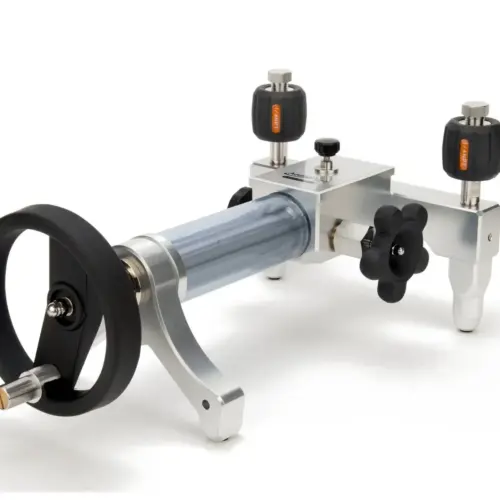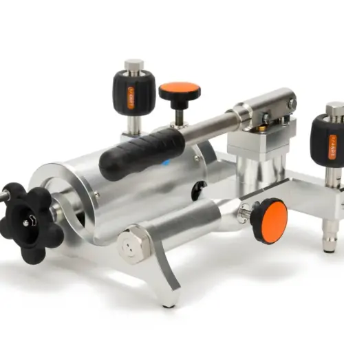 The 912A Pneumatic Pressure Test Pump is a hand operated pressure pump designed to generate pressure from 95% vacuum to 60psi (4bar). A high-quality screw press is designed for fine pressure adjustment, with an adjustment resolution up to 0.1 Pa (0.001 mbar). The 912A is a very stable low pressure calibrator. It makes use of an isothermal bellows chamber which is designed for reducing the possible effects of environmental temperature change. Most pumps make use of a check valve (non-returning valve) and are not well insulated which will cause large fluctuations in pressure with a change in ambient temperature or when the unit is touched. The 912A does not use a check valve and is remarkably stable. Two hand-tight connectors installed on the pump allow easy connecting and disconnecting to the test pump without the need for PTFE tape or wrenches. The 912A is an ideal comparison test pump for low pressure application.