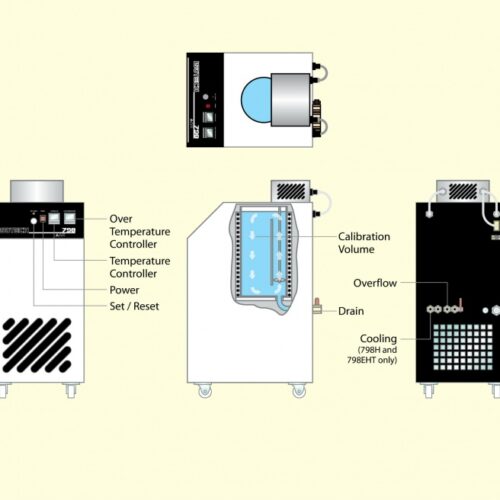 The immersion depth of 300mm allows the requirements of “Supplementary Information to the ITS-90” to be met. This publication from BIPM recommends immersion depths of 15 to 20cm from -50°C to 50°C, and from 20 to 27cm at 200°C. Many baths in this price range are simply not deep enough to meet this requirement. Rather than simply stirring a square tank of liquid the Hydra uses parallel tube action for superior temperature uniformity. Like other Isotech liquid baths the calibration volume is cylindrical to suit thermometers, not a large square tank. The bath is filled with just 5 litres of liquid reducing filling and ongoing cost of ownership as liquids are replenished. The 798H and 798EHT feature a cooling coil which can be attached to an external source of either cold water or gas to further reduce cool down times.