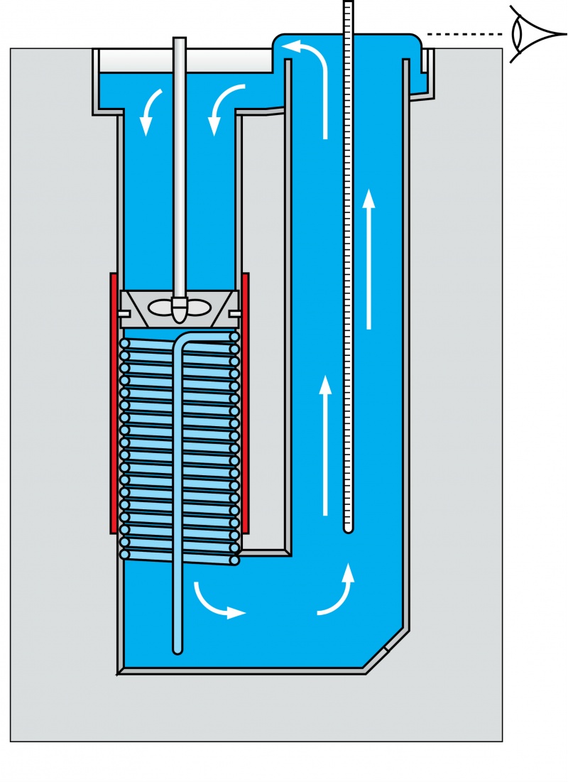 The key feature is the physical separation of the chamber in which the liquid is heated or cooled from the chamber that contains the calibration volume in which the thermometers are placed.